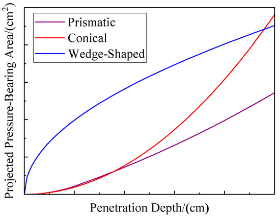 For a given soil type, the variability in soil compaction is limited, allowing it to be approximated as a deterministic value. Consequently, the penetration resistance of the hole-forming mechanism is directly governed by its projected pressure-bearing area. Assuming identical seed inlet diameters at the upper ends of both the wedge-shaped and conical duckbills, along with equivalent maximum hole depths, the projected pressure-bearing area at penetration depth h is calculated as follows: