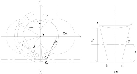 When the hole profile corresponds to Figure 5a,b (λ < R/Rm), the film hole length |ac| formed during soil engagement is determined by the motion trajectories of both the duckbill’s rear surface AB and front surface CD. By symmetry in duckbill geometry and motion paths, we analyze only the front surface CD below. The envelope equation of CD’s trajectory is: