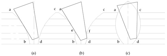 The morphology of the hole profile is governed by the motion characteristic parameter λ, and can be categorized into three cases. When λ ≤ 1 (Figure 5a), the profile consists of three segments (ab, bc, and cd). Among them, segment ab is generated by soil compression from the rear surface AB of the duckbill during soil entry, while segment cd is formed by compression of the soil by the front surface CD during soil exit. When 1 < λ < R/Rm (where R denotes the radius of the hole-forming disk, in mm) (Figure 5b), the profile comprises five segments (ae, eb, bd, cf, and fd). Segments ae and cf are produced by compression of the soil from the rear surface AB (entry) and the front surface CD (exit), respectively, whereas segments eb and fd result from shearing action exerted by the rear endpoint B (exit) and the front endpoint C (entry). Finally, when λ ≥ R/Rm (Figure 5c), the profile reduces to two segments (ab and cd). Segment ab is formed by soil shearing due to the rear endpoint B during soil exit, while segment cd is generated by shearing from the front endpoint D during soil entry.