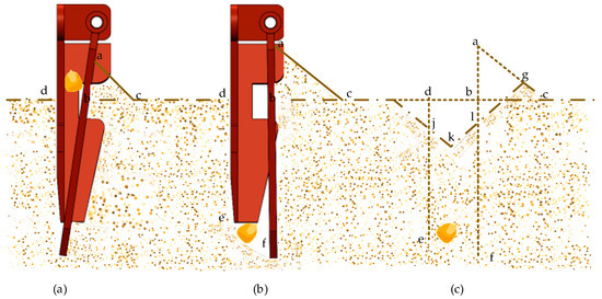 Figure 6 shows a cross-section of lateral soil disturbance during the hole-forming process. When the hole-forming device initiates operation, the duckbill is initially closed. Its tip reaches the specified depth following the rotational path of the hole-forming disk. Simultaneously, seeds within the duckbill descend to the top of the bill during soil penetration, as depicted in Figure 6a. At this stage, soil originally occupying the duckbill’s position is laterally displaced by the compressive action of the moving and fixed duckbills. The displaced soil accumulates at its natural angle of repose. Segments ac represent repose boundaries consisting of dry topsoil, while zones be denote moist subsurface soil in direct contact with the duckbill surfaces. Subsequently, the roller controlling the duckbill’s opening/closing moves along the opening segment of the cam profile. The moving duckbill is positively driven open by the force-transmitting linkage connected to the roller, while seeds within the duckbill descend onto the seedbed under gravitational force.