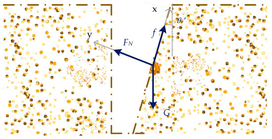 where f is the frictional force acting on soil particles, N; G is the gravitational force acting on soil particles, N; θ′ is the inclination angle of moving duckbill relative to vertical plane at full opening, rad; Fy is the net force acting on soil particles along the y-axis, N; μ is the inter-soil frictional coefficient; FN is the normal contact force acting on soil particles, N; m is the soil quality, kg; G is the gravitational acceleration, m/s2.