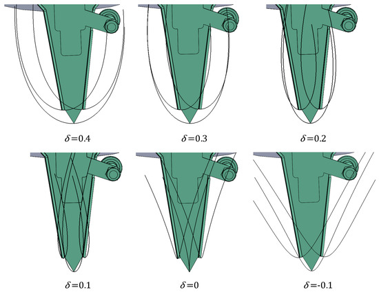 Figure 8 depicts the trajectories of duckbill tips under varying δ, with the outermost contour width in each trajectory representing cavity size. When δ > 0.1, the contour width decreases as δ is reduced; however, with further decreases in δ, the width gradually increases. At δ = −0.9, the widened trajectory contour indicates an excessively large cavity, resulting in oversized film holes that do not meet agronomic specifications for precision seeding.