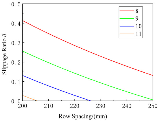 As derived from the equation, when the structural dimensions of the hole-forming duckbills are fixed, the slippage ratio δ depends on the number of duckbills (Z) and the intra-row spacing (l). Figure 9 plots the variation of δ versus l (200–250 mm) for duckbill quantities Z at a constant operating speed v = 4 km/h (1.11 m/s). The graph demonstrates that: Only the curve for Z = 9 satisfies δ ∈ (0, 0.3) across the entire spacing adjustment range. Thus, configuring nine duckbills on the hole-forming disk ensures optimal film penetration quality when adjusting spacing within specifications.