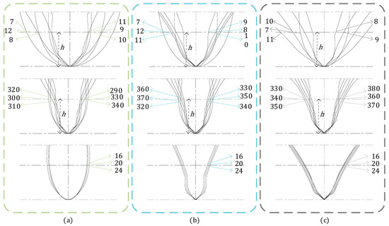Figure 10a–c first line illustrate the film hole profiles generated under varying duckbill quantities at planting spacings of 200 mm, 225 mm, and 250 mm, respectively. When the duckbill quantity (Z) increases while other parameters remain constant, the film hole length exhibits a convex trend, initially decreasing and then increasing across all three spacing conditions. The value of Z corresponding to the minimum film hole length differs with planting spacing: at l = 200 mm, the minimum occurs at Z = 10; at l = 225 mm, at Z = 9; and at l = 250 mm, between Z = 8. These results establish two key relationships: (i) for a fixed planting spacing, the film hole length decreases and then increases with Z; and (ii) the optimal Z value minimizing film hole length shifts upward with increasing planting spacing.