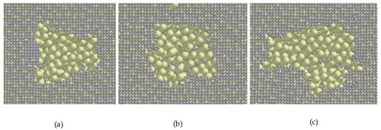 The disturbance of soil caused by the duckbill opener is closely related to its entry trajectory, which can be classified into three types according to the kinematic parameter λ, as illustrated in Figure 7. When λ ≤ 1, as shown in Figure 5a, the disturbance is mainly governed by longitudinal compression and local sliding during the entry and exit of the duckbill. In this case, soil particles are primarily compacted in the longitudinal direction, leading to a reduction in porosity. The disturbed zone is confined to the vicinity of the duckbill, with limited soil backflow and the cavity boundaries remaining relatively intact. When 1 < λ < R/Rm, as shown in Figure 5b, soil disturbance is primarily characterized by compression of the upper side of the cavity and shear-induced overturning of the lower side during the entry and exit process. The upper rim of the cavity is uplifted with partial soil backflow, while the lower side is cut and overturned into the cavity, resulting in moist soil at the bottom gradually covering the seeds. When λ > R/Rm, as shown in Figure 5c, the disturbance is dominated by overall shearing and stirring of the soil at the cavity location. In this case, a large volume of soil is displaced and scattered, forming cavities of greater size and extending the disturbance zone to the surrounding soil. The soil skeleton structure is significantly disrupted and the post-disturbance cavity fails to provide a uniform and stable seedbed.