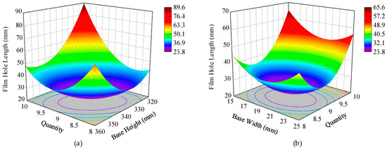 Effects of duckbill quantity combined with base height and base width on film hole length. (a) Quantity and Base Height; (b) Quantity and Base Width.