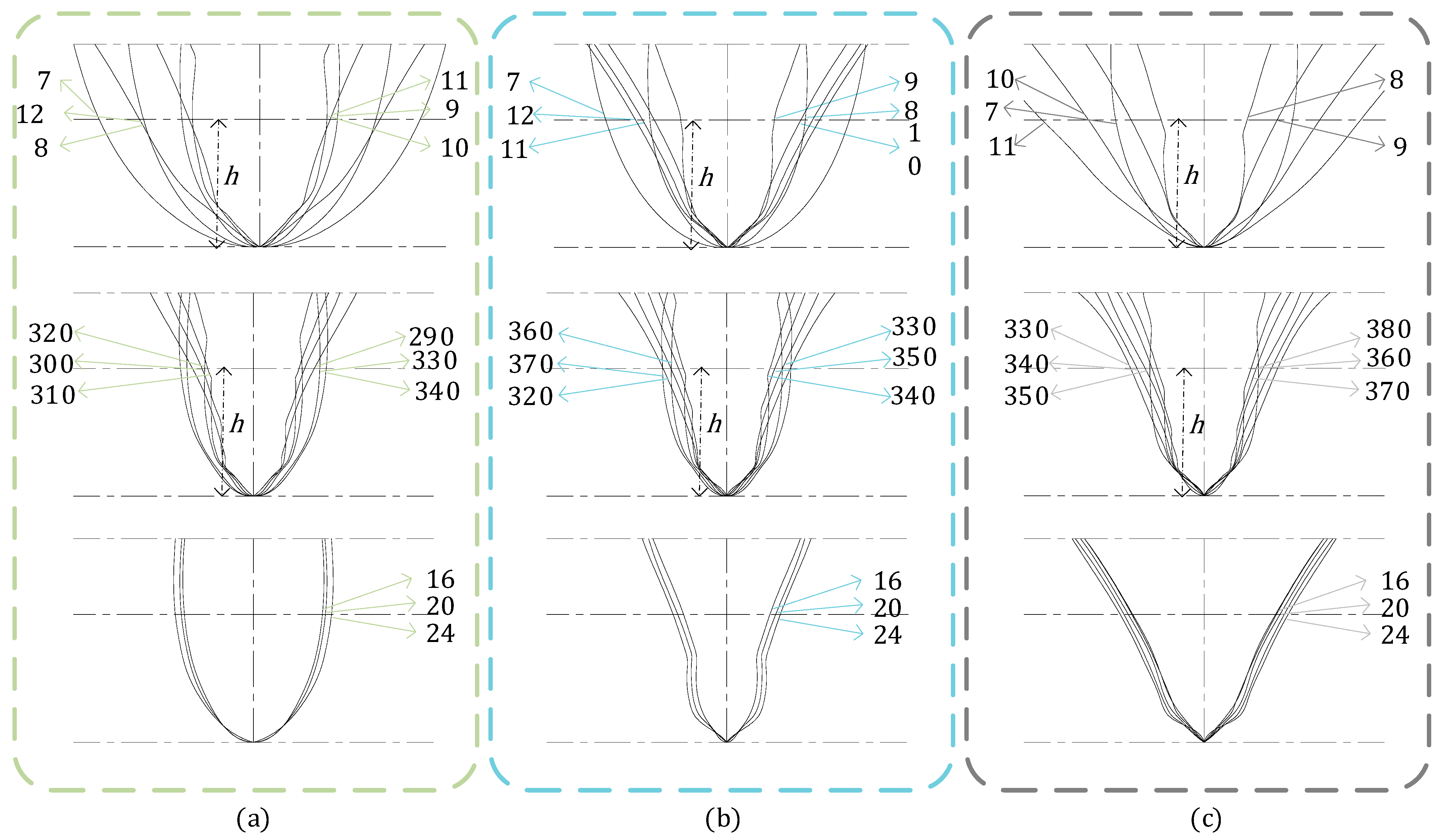 Figure 10a–c second line present the film hole profiles formed at different duckbill base heights under planting spacings of 200 mm, 225 mm, and 250 mm, respectively. The analysis shows that at
