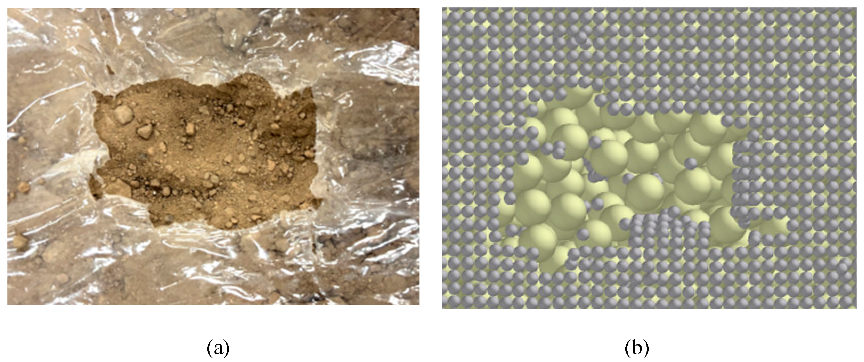 In the dynamics software, establish corresponding constraints and kinematic pairs while adding drives to control the mechanism’s motion. In the discrete element software, establish a discrete element model of soil, import the hole-forming device model, and set corresponding contact parameters. Export co-simulation files according to coupling requirements of the discrete element and dynamics software, configure parameters, and finally control the experiment through the simulation interface to obtain test data in the discrete element software. Main simulation parameters are listed in