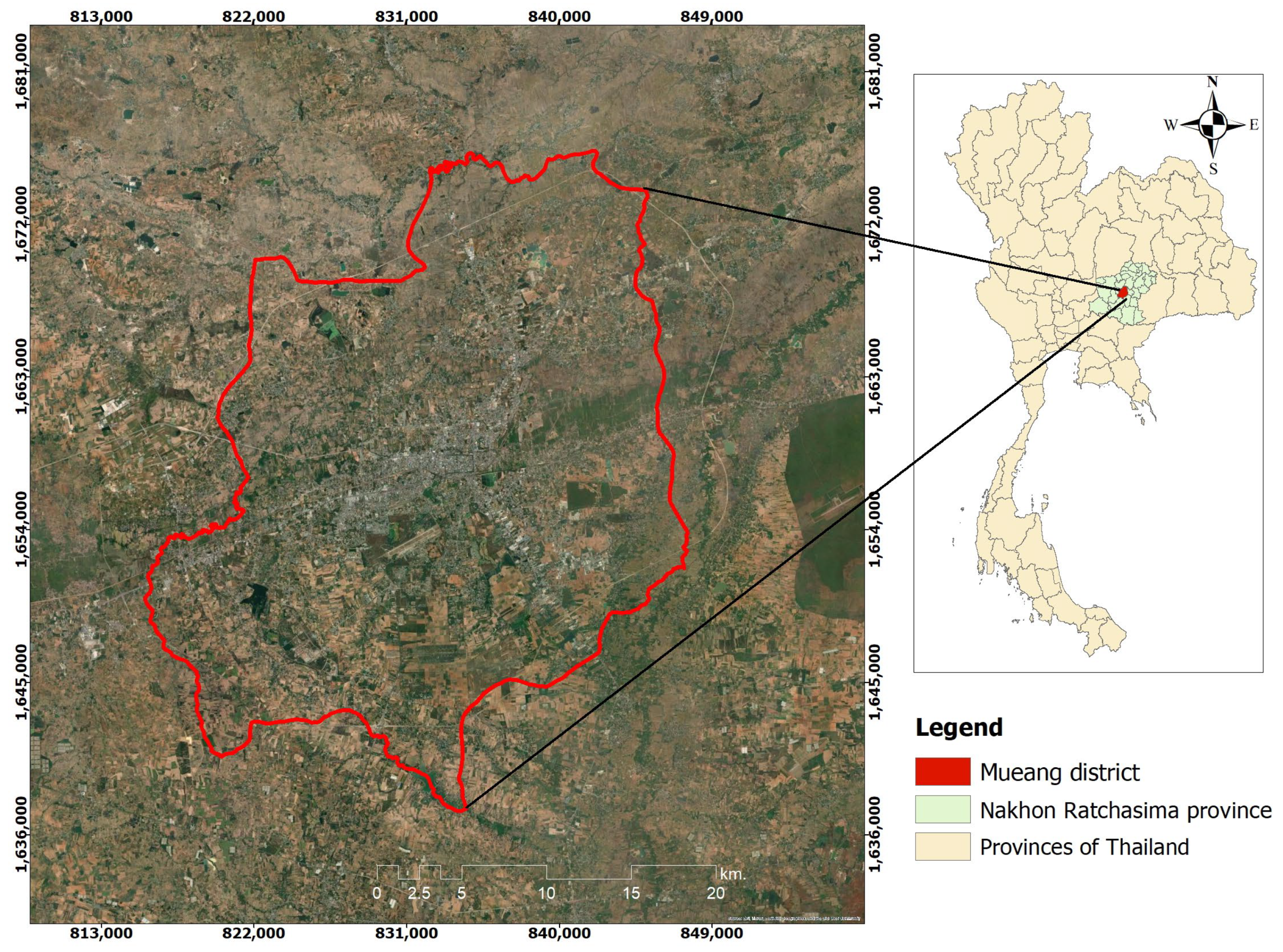 - Additional relevant data, including administrative boundary data from FAO, and 2023 land use and land cover data for Nakhon Ratchasima Province, obtained from the Land Use Policy and Planning Division, Department of Land Development, Ministry of Agriculture and Cooperatives, along with ground truth survey data.