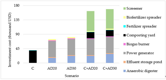 Fixed investments (USD) required for the implementation and installation of composting and anaerobic digestion systems in each production scenario.