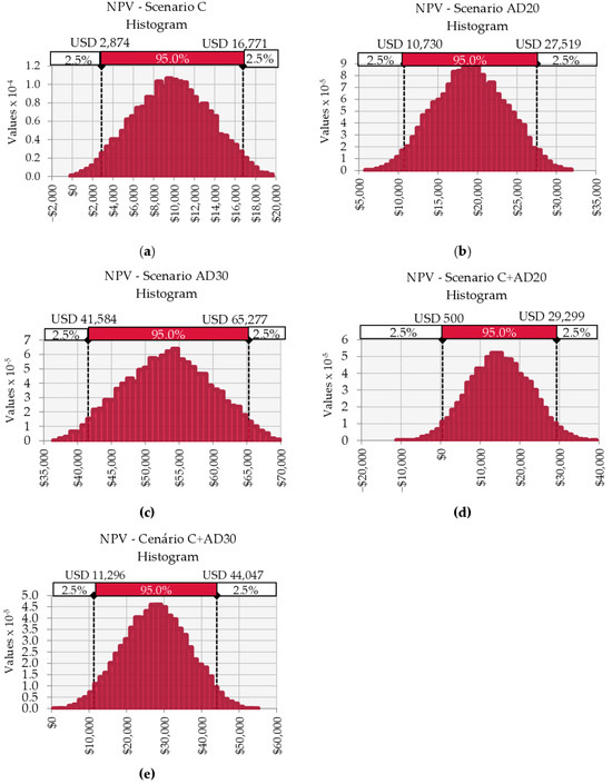 Monte Carlo simulation of the Net Present Value (NPV) for the treatment scenarios of cattle manure: (a) C: composting; (b) AD20: anaerobic digestion with a hydraulic retention time (HRT) of 20 days; (c) AD30: anaerobic digestion with HRT of 30 days; (d) C+AD20: composting and anaerobic digestion with HRT of 20 days; (e) C+AD30: composting and anaerobic digestion with HRT of 30 days.