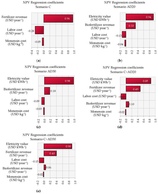Sensitivity analysis of the Net Present Value (NPV) based on regression coefficients, by cattle manure treatment scenario: (a) C: composting; (b) AD20: anaerobic digestion with a hydraulic retention time (HRT) of 20 days; (c) AD30: anaerobic digestion with HRT of 30 days; (d) C+AD20: composting and anaerobic digestion with HRT of 20 days; (e) C+AD30: composting and anaerobic digestion with HRT of 30 days.