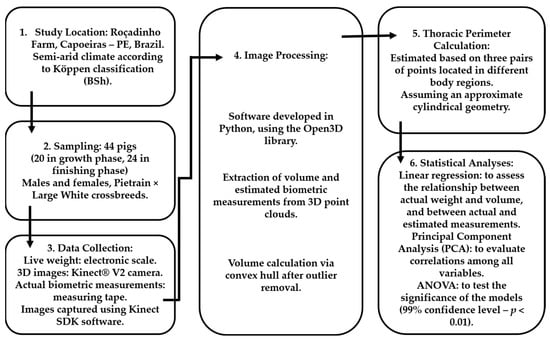 Estimated population growth and increased demand for food production bring with them the evident need for more efficient and sustainable production systems. Because of this, computer vision plays a fundamental role in the development and application of solutions that help producers with the issues that limit livestock production in Brazil and the world. In addition to being stressful for the producer and the animal, the conventional pig weighing system causes productive losses and can compromise meat quality, being considered a practice that does not value animal welfare. The objective was to develop a computational procedure to predict the live weight of pigs in the growth and finishing phases, through the volume of the animals extracted through the processing of 3D images, as well as to analyze the real and estimated biometric measurements to define the relationships of these with live weight and volume obtained. The study was conducted at Roçadinho farm, in the municipality of Capoeiras, located in the Agreste region of the state of Pernambuco, Brazil. The variables weight and 3D images were obtained using a Kinect®—V2 camera and biometric measurements of 20 animals in the growth phase and 24 animals in the finishing phase, males and females, from the crossing of Pietrain and Large White, totaling 44 animals. To analyze the images, a program developed in Python (PyCharm Community Edition 2020.1.4) was used, to relate the variables, principal component analyses and regression analyzes were performed. The coefficient of linear determination between weight and volume was 73.3, 74.1, and 97.3% for pigs in the growing, finishing, and global phases, showing that this relationship is positive and satisfactorily expressed the weight of the animals. The relationship between the real and estimated biometric variables had a more expressive coefficient of determination in the global phase, having presented values between 77 and 94%.