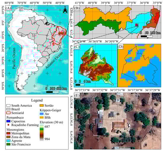 South America (A); Pernambuco Mesoregions (B); Capoeiras hypsometry (C); Köppen classification (D); Geolocation of Roçadinho Farm (E).