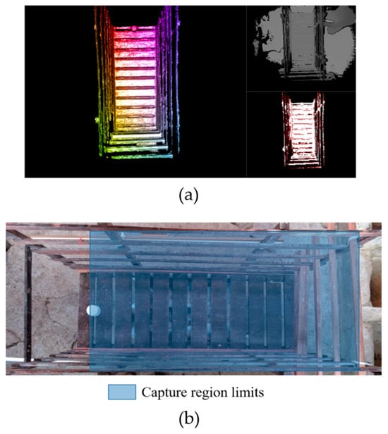 Software capture screen showing the empty chute (a); top view of the containment chute and demarcation of the image capture region (b).