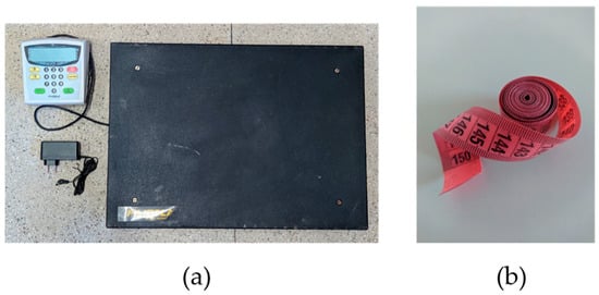 Image of Filizola electronic scale (a) and plastic measuring tape (b).