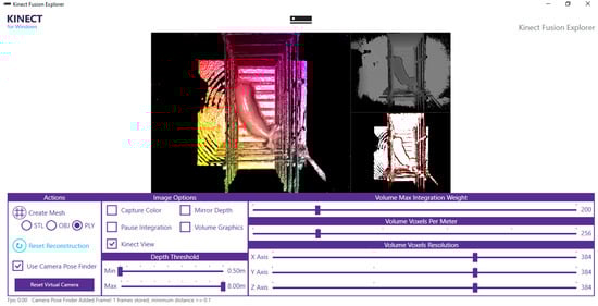 The pigs were taken to a containment chute attached to a Filizola electronic platform scale with a maximum capacity of 300 kg, a minimum of 2 kg, and an accuracy of 100 g (Figure 4a), where the animals were weighed. Images were captured using the Kinect for Windows Software Development Kit (SDK), version 7.1, running on a notebook connected to the camera (Figure 5). Actual biometric measurements were obtained using a simple plastic sewing measuring tape, 1.5 m long (150 × 2 cm), marked in centimeters and graded in millimeters (Figure 4b). Estimated measurements were obtained through depth image analysis. After obtaining the necessary information, the pigs were properly identified and released.