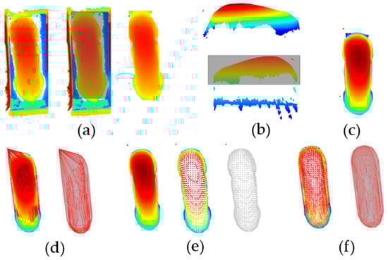 After the 3D top-view acquisition, which generated the animal’s point cloud, preprocessing steps were applied to reduce external interference and isolate the region of interest (the animal’s body). Two crops were performed, one superior (Figure 10a) and one lateral (Figure 10b), delineated by gray boxes, along with the removal of an additional layer to enhance the definition of the convex hoof (Figure 10f), resulting in the estimation of body volume.