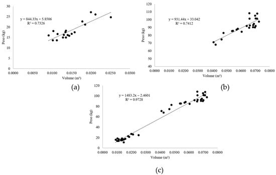 Graphic representation of the relationship between the live weight of pigs (Weight, kg) and Volume (m3) for the growth stages (a); finishing (b) and global (c).