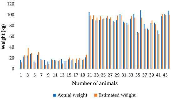 The equation generated by the model through regression analysis and applied to the volume values to estimate the weight in the two breeding phases, when the estimated weights were compared with the real weights (Figure 12), with an average difference of 4.38 kg. Using video camera images [] obtained an accuracy equal to 96.2% with an error of 1.23 kg in predicting the individual weight of pigs, while [] using a Kinect camera and body parameters obtained a prediction equation with a mean error of 2.961 kg. According to these results, the model is reliable and representative, with less variance in the data referring to the finishing phase.