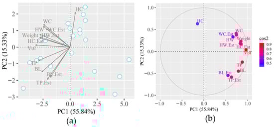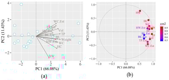 It is observed through the PCA that the principal component 1 (PC1) is responsible for representing 55.84% of the existing correlation between the variables, while the principal component 2 (PC2) is responsible for only 15.33%, before that, the cumulative total variance of the variables studied was 71.17% (Figure 14b). The color scale shows that the highest correlation was presented by Weight, WC, and TP, with values close to 0.9; HW, HW.Est, HC.Est, Vol, BL, and TP.Est remained with values between 0.8 and 0.6. The variables that showed the lowest correlation were BL.Est, WC.Est and HC, with values lower than 0.6.