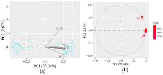 In the growth phase, it is observed through the PCA that the main component 1 (PC1) is responsible for representing 66.08% of the existing correlation between the variables, while the main component 2 (PC2) is responsible for only 11.43%, therefore, the cumulative total variance of the variables studied was 77.51% (Figure 14b). The correlation of the main components, based on Pearson’s correlation (high correlation—coefficient tends to be 1 or −1) is presented in the color scale, with the correlation coefficient (cos2) lower than 0.7 presented by the estimated variables HC.Est, BL.Est, TP.Est and HW.Est. In this same scenario, the variables that presented a correlation coefficient close to 0.9 were Weight, TP, Vol, HC, and HW.