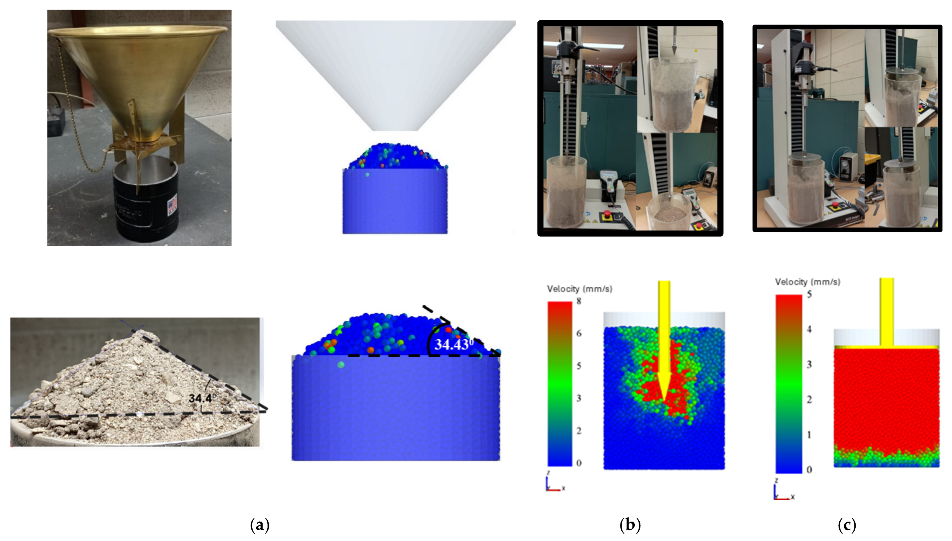 3.1. DEM Soil Model Calibration Prediction of Angle of Repose Test, Uniaxial Confined Compression Test and Cone Penetrometer