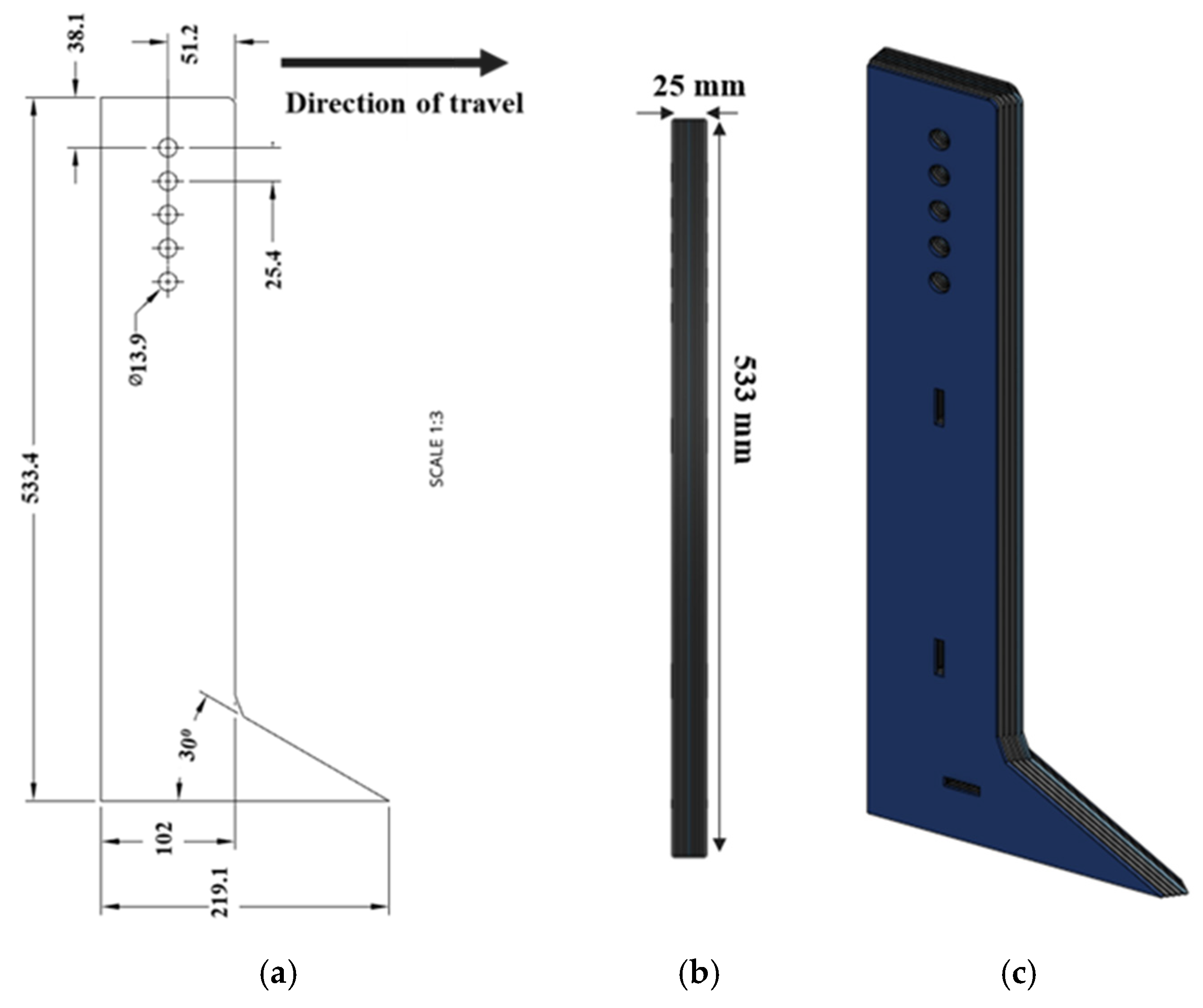 - Fielke, J.M.; Ucgul, M.; Saunders, C. Tillage tool design effects on draft and soil disturbance: An experimental and DEM study. Soil Tillage Res. 2013, 134, 13–20. [Google Scholar]