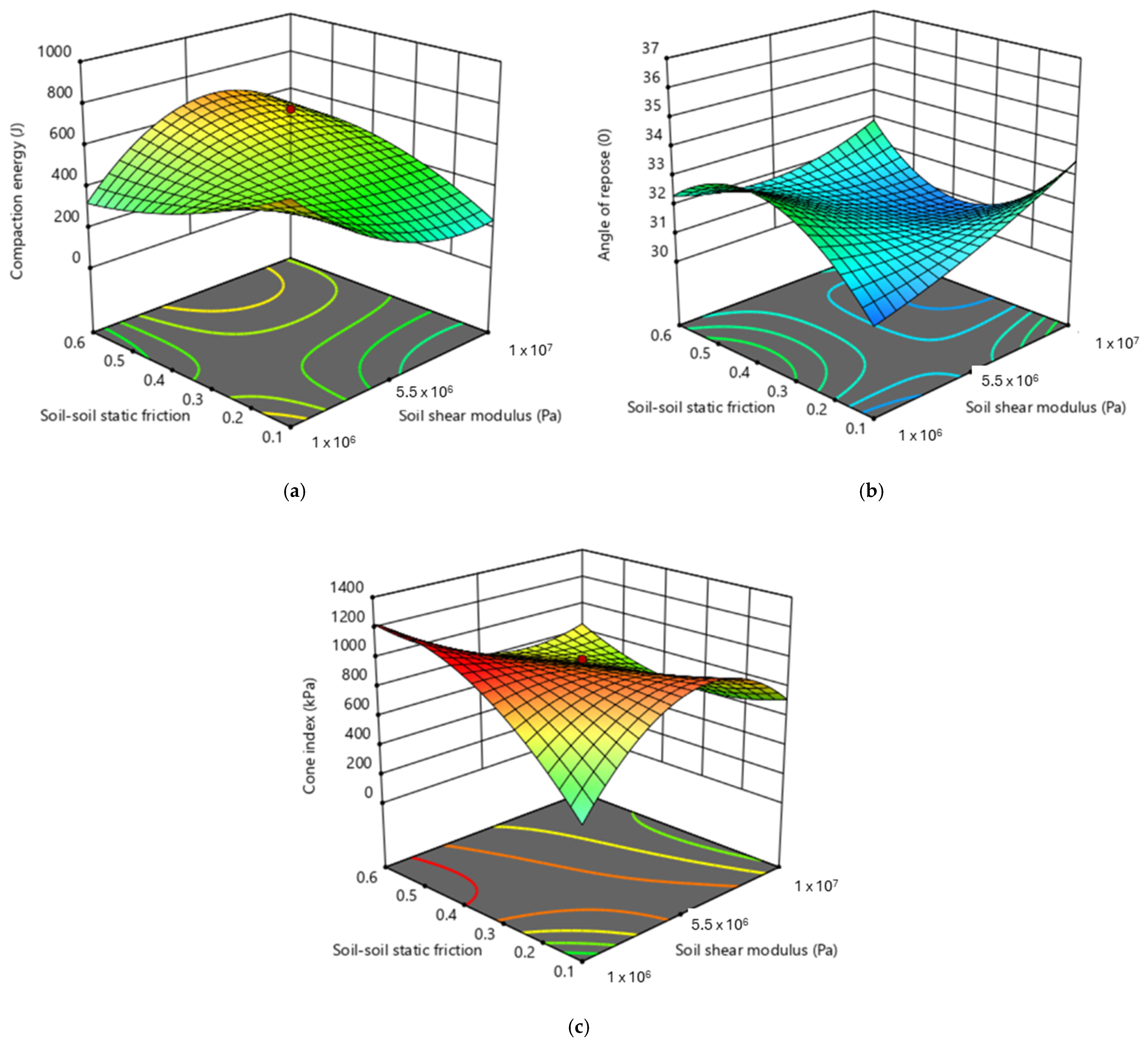 3.2. Verification of DEM Soil Model Predictions for Angle of Repose, Uniaxial Confined Compression, and Cone Penetrometer Tests of Bayer Sandy Loam