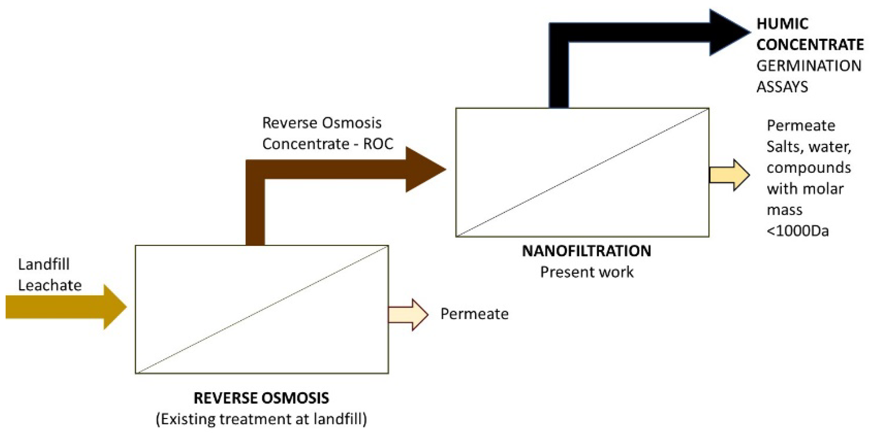 - Ye, W.; Liu, H.; Jiang, M.; Lin, J.; Ye, K.; Fang, S.; Xu, Y.; Zhai, S.; Van der Bruggen, B.; He, Z. Sustainable management of landfill leachate concentrate through recovering humic substance as liquid fertilizer by loose nanofiltration. Water Res. 2019, 157, 555–563. [Google Scholar] [CrossRef]
