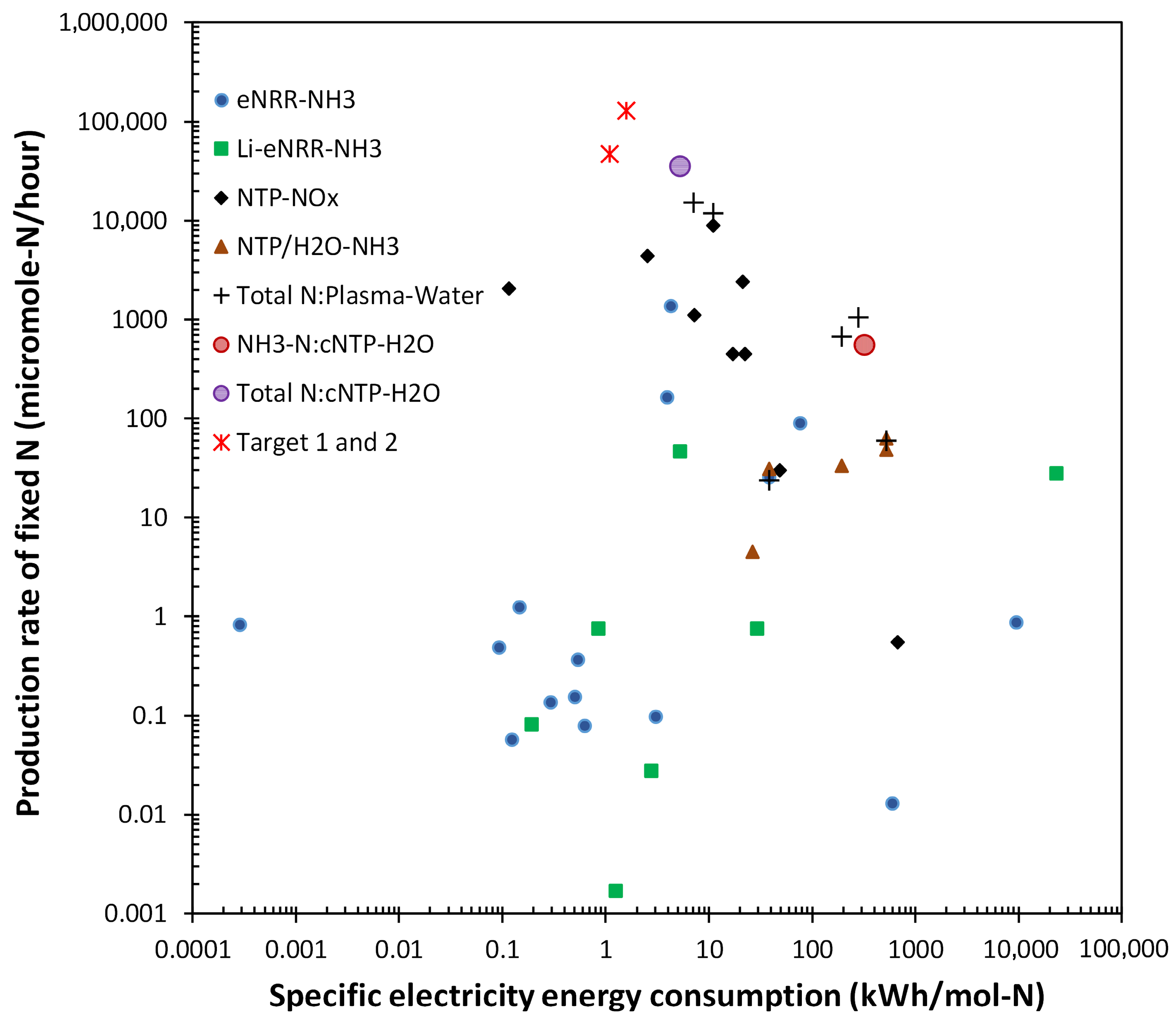 - While the oxidation pathway is kinetically favored, chemical pathways exist that allow for the simultaneous production of both ammonium (via the reduction pathway) and nitrate (via the oxidation pathway) from water and air using the cNTP-H2O system. The composition of the fixed nitrogen products can potentially be adjusted by altering the system’s process parameters and configuration.