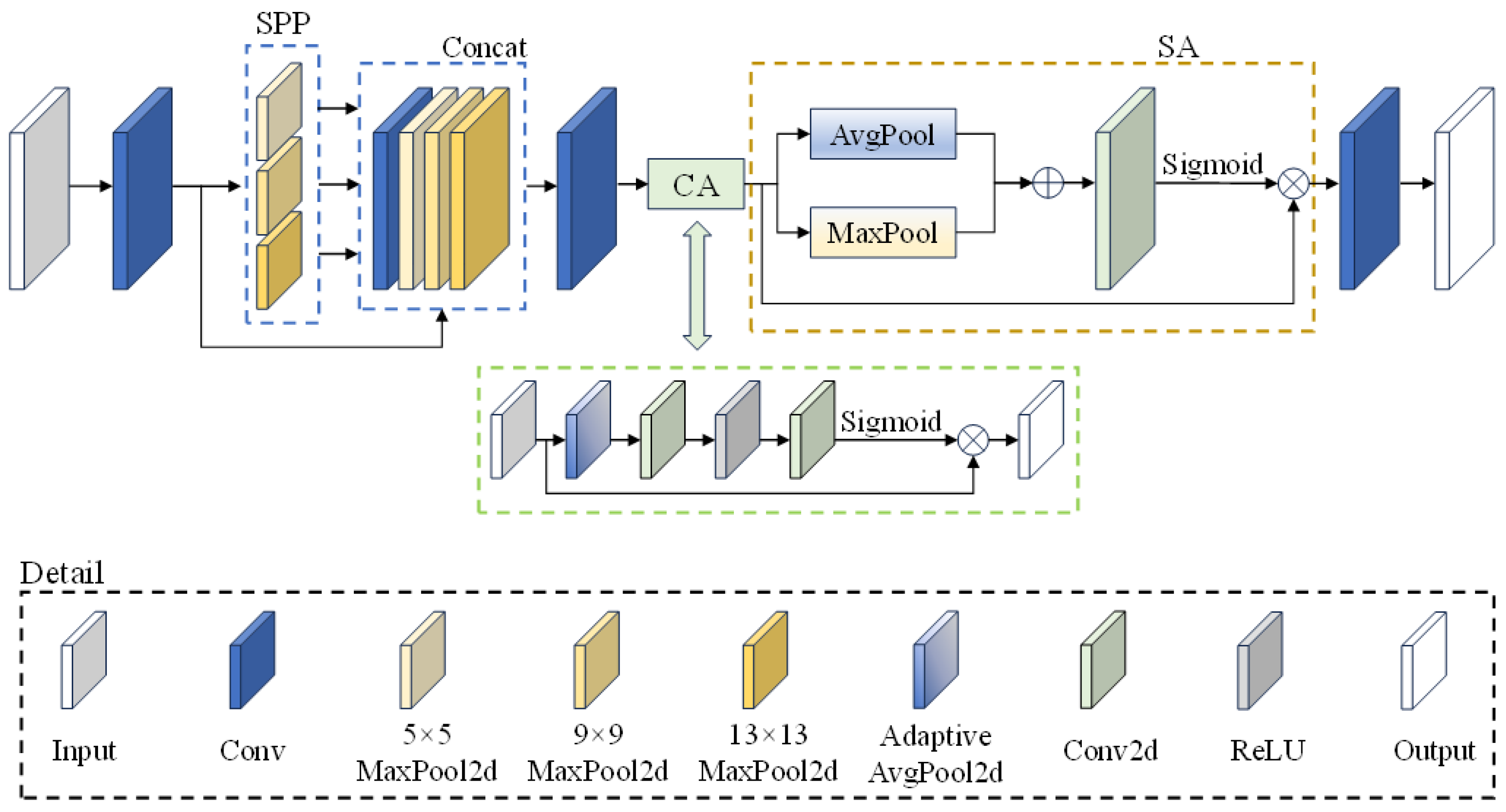 Finally, a 1 × 1 convolution is applied to further consolidate the feature map enhanced by the attention mechanism, ensuring that the output dimension matches the input size, thereby replacing the original SPPF module with the GAM-SPP.