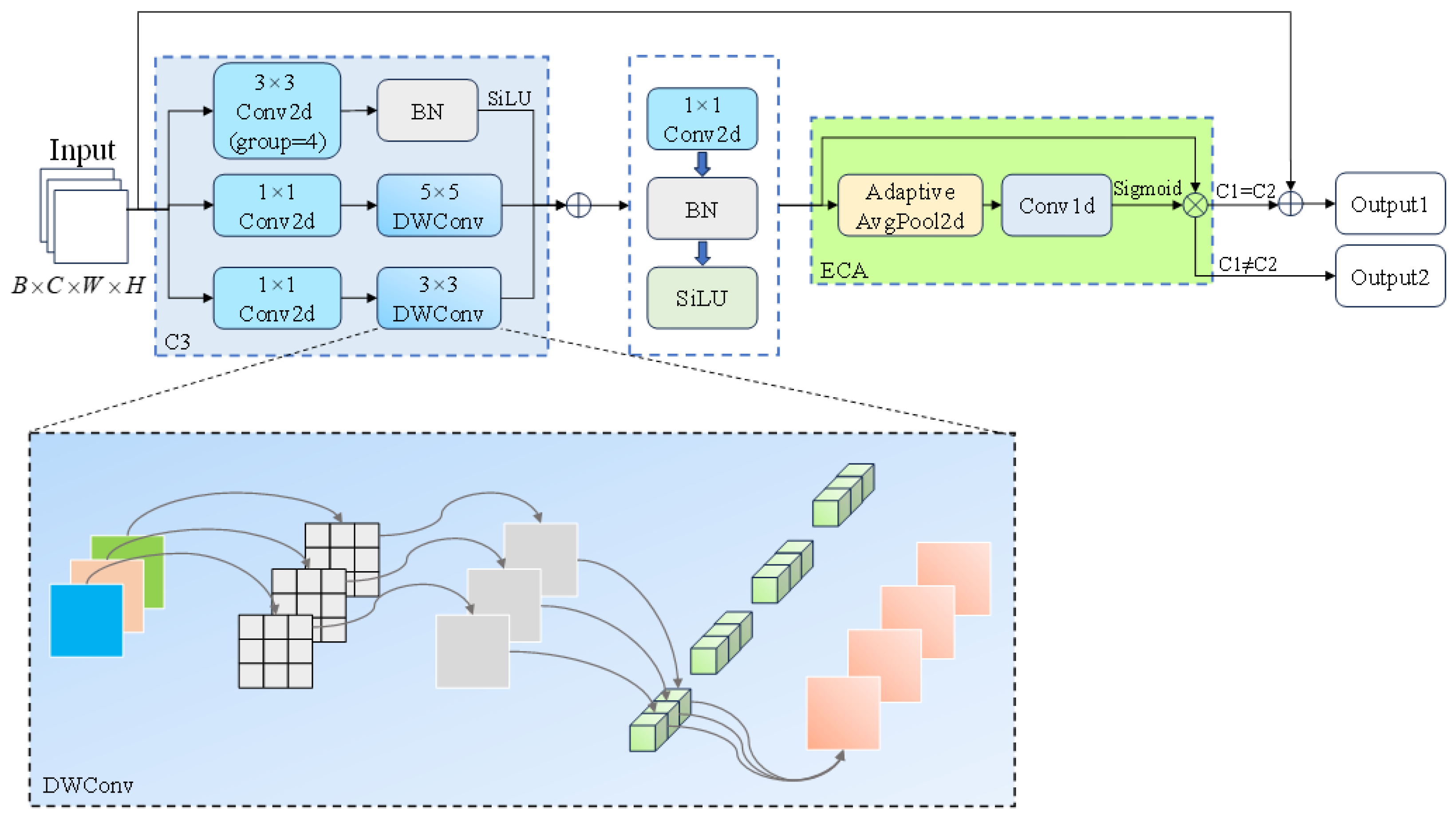 2.2. Design of the C3-EFSA Module Based on Multi-Scale DWConv and Lightweight ECA Mechanism