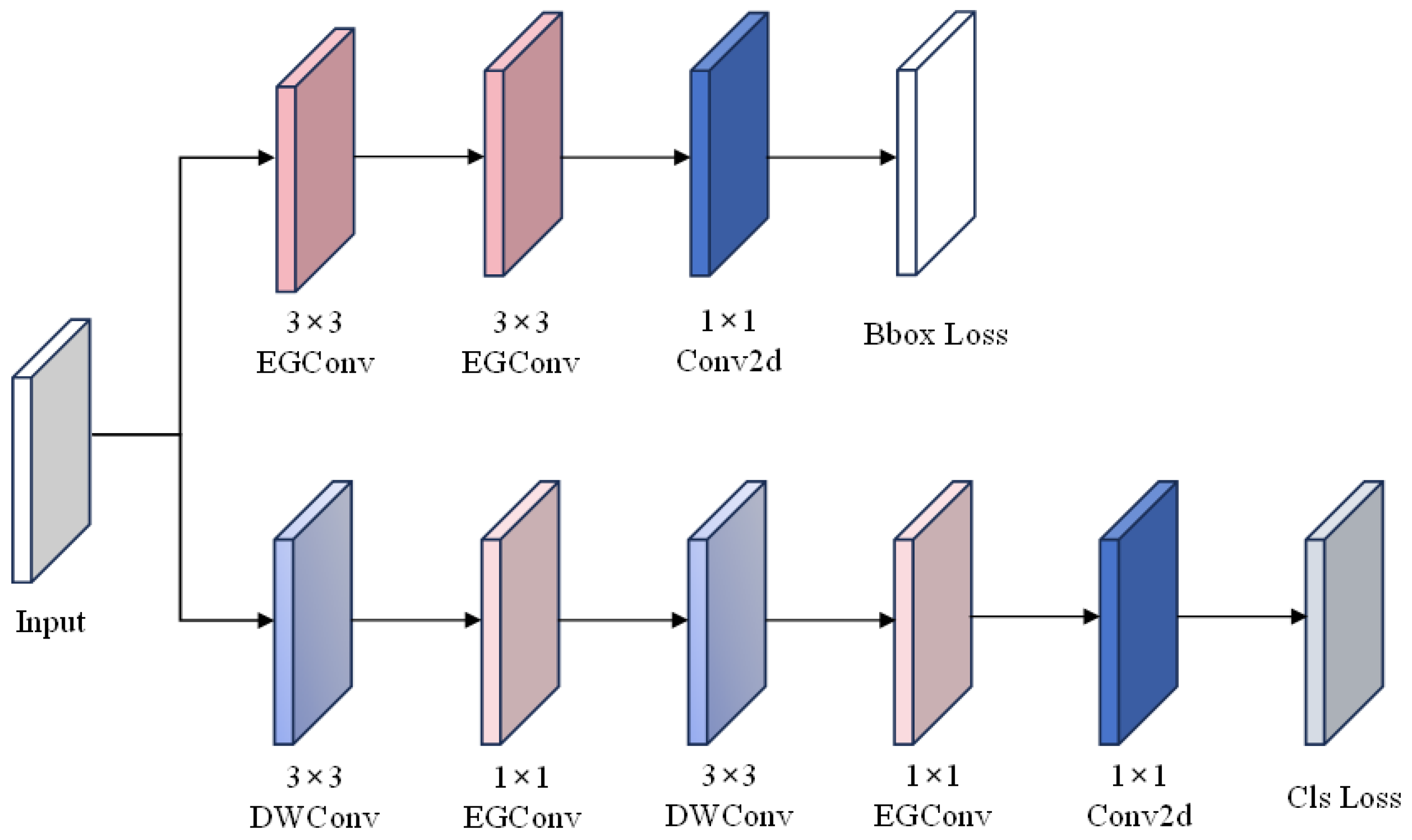 Figure 4, the original Detect module of YOLO11n consists of multiple standard convolution layers for bounding box regression and object classification. However, standard convolutions exhibit high feature redundancy and limited expressiveness, particularly when dealing with small or low-contrast targets. To reduce feature redundancy and enhance the focus on key target regions, this paper proposes a novel EGConv module based on Ghost Convolution [