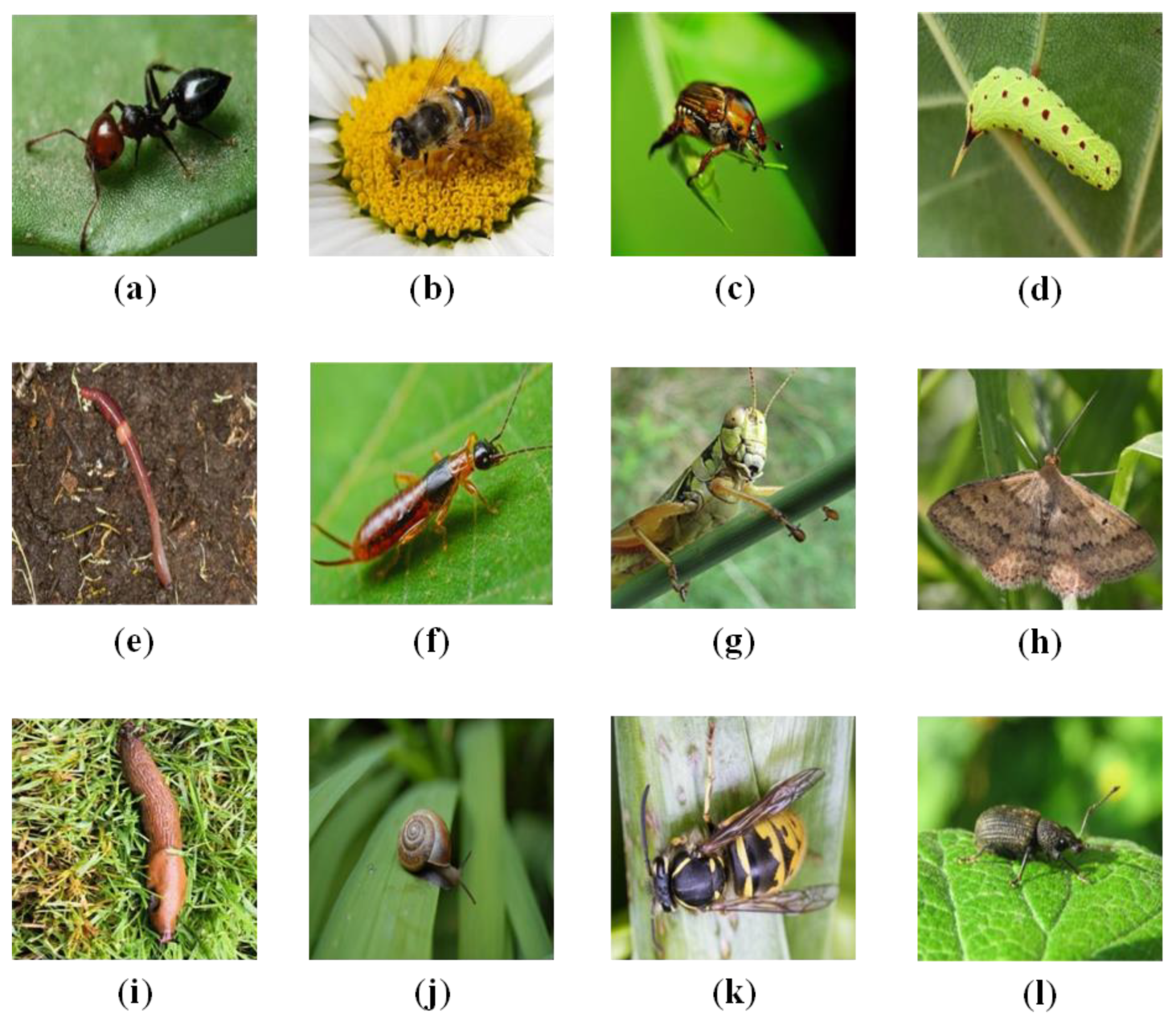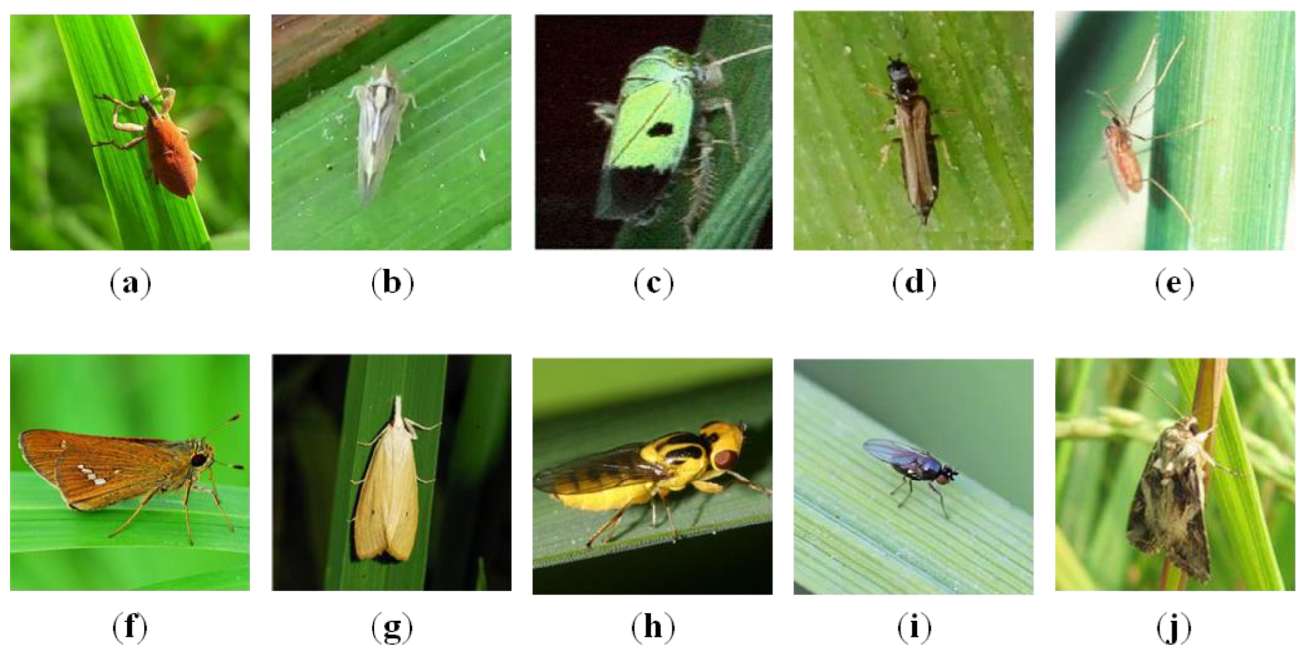 IP102 is the largest publicly available pest image dataset in agriculture, containing 75,222 images across 102 pest categories. However, it includes many duplicates, irrelevant, and misclassified images, leaving only a few usable samples. In this study, we extracted rice pest images, removed duplicates, cleaned the data, and manually reviewed it with the help of experts from our university’s Plant Protection College, resulting in 4226 valid samples. The rice pests were annotated in YOLO format using LabelImg 1.8.6. The annotation adopts a double-blind protocol, with two people independently annotating. If there are differences in the annotation boxes or categories, they will be reviewed by experts from our university’s Plant Protection College. The new dataset, named RicePest-10 (RP10), contains 10 rice pest categories, shown in