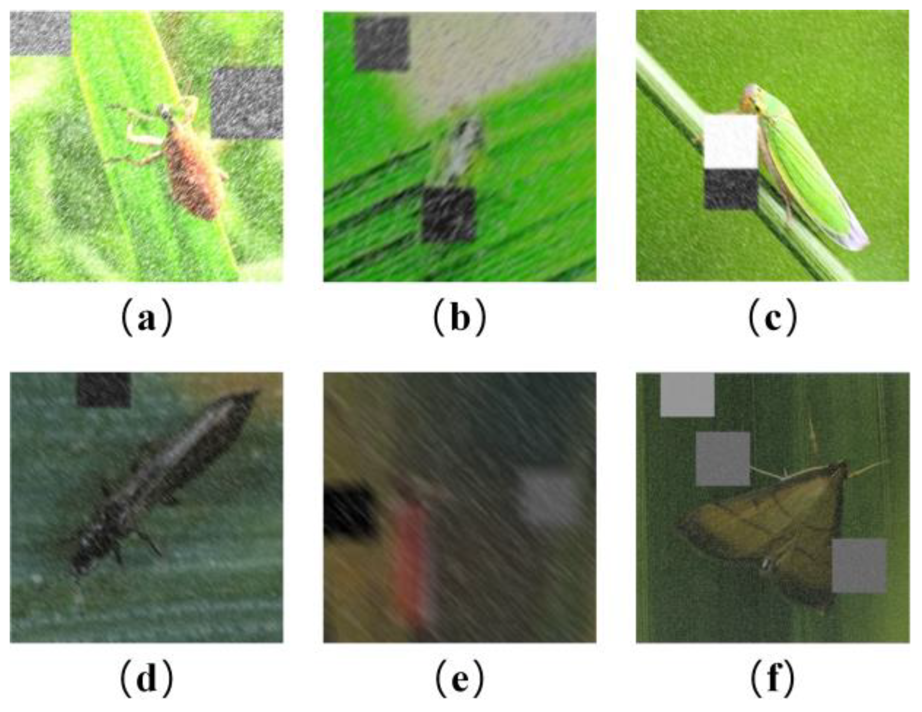 To enhance the generalization and robustness of the model, four data augmentation techniques were applied to the training set: random brightness, motion blur, random rectangular occlusion, and salt-and-pepper noise. These methods simulate various real-world interferences, such as complex lighting changes, plant oscillations, camera shake, leaf occlusions, and imaging noise, in rice paddy fields. Specifically, random brightness simulates light variations under weak light before and after sunrise, overexposure at noon, and low light at dusk; motion blur replicates the blurring and trailing effects caused by device shake or wind-induced plant movement; random rectangular occlusion mimics partial or large-area occlusion of pests by rice leaves or panicles; salt-and-pepper noise simulates noise from imaging devices or the environment. By applying these four augmentation techniques, the training set was expanded to double its original size, reaching 6750 images, while the validation and test sets remained unchanged, thereby improving the model’s generalization ability and robustness. Examples of the augmented training set are shown in