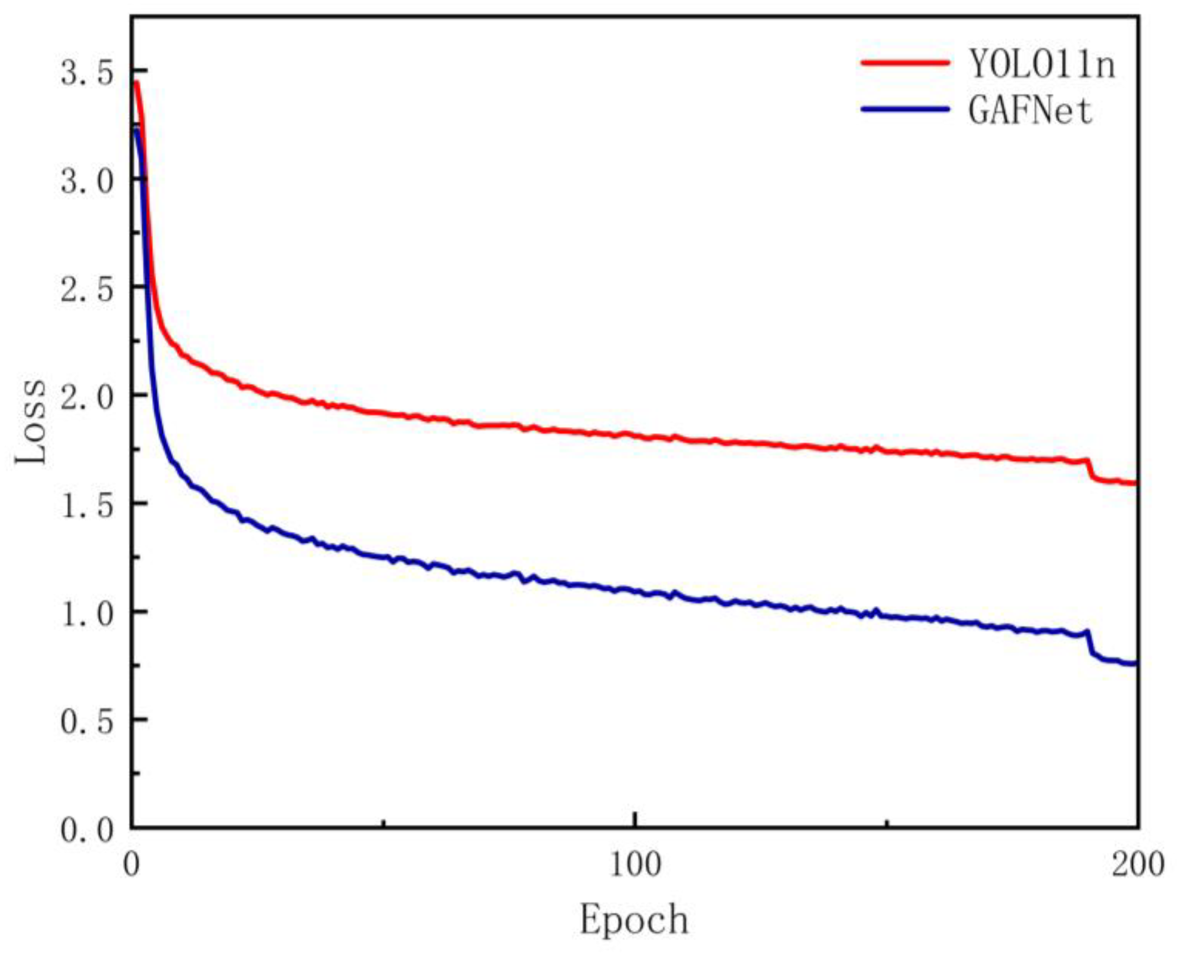 Figure 9, the loss curve for different epochs during the training process demonstrates a smooth convergence trend, characterized by a sharp initial decline followed by a gradual reduction. Compared to YOLO11n, the GAFNet model proposed in this paper exhibits lower loss values and faster convergence, preliminarily validating the advantages of the proposed method during the model training phase. The evaluation results on the test dataset indicate that the GAFNet model achieves an accuracy of 89.8%, a Recall rate of 85.6%, and an mAP of 90.1%, while the model’s parameter count is only 2.45 M and its computational load is merely 5.0 GFLOPs. These results highlight the model’s strong performance-to-efficiency ratio, achieving high accuracy with minimal computational overhead.