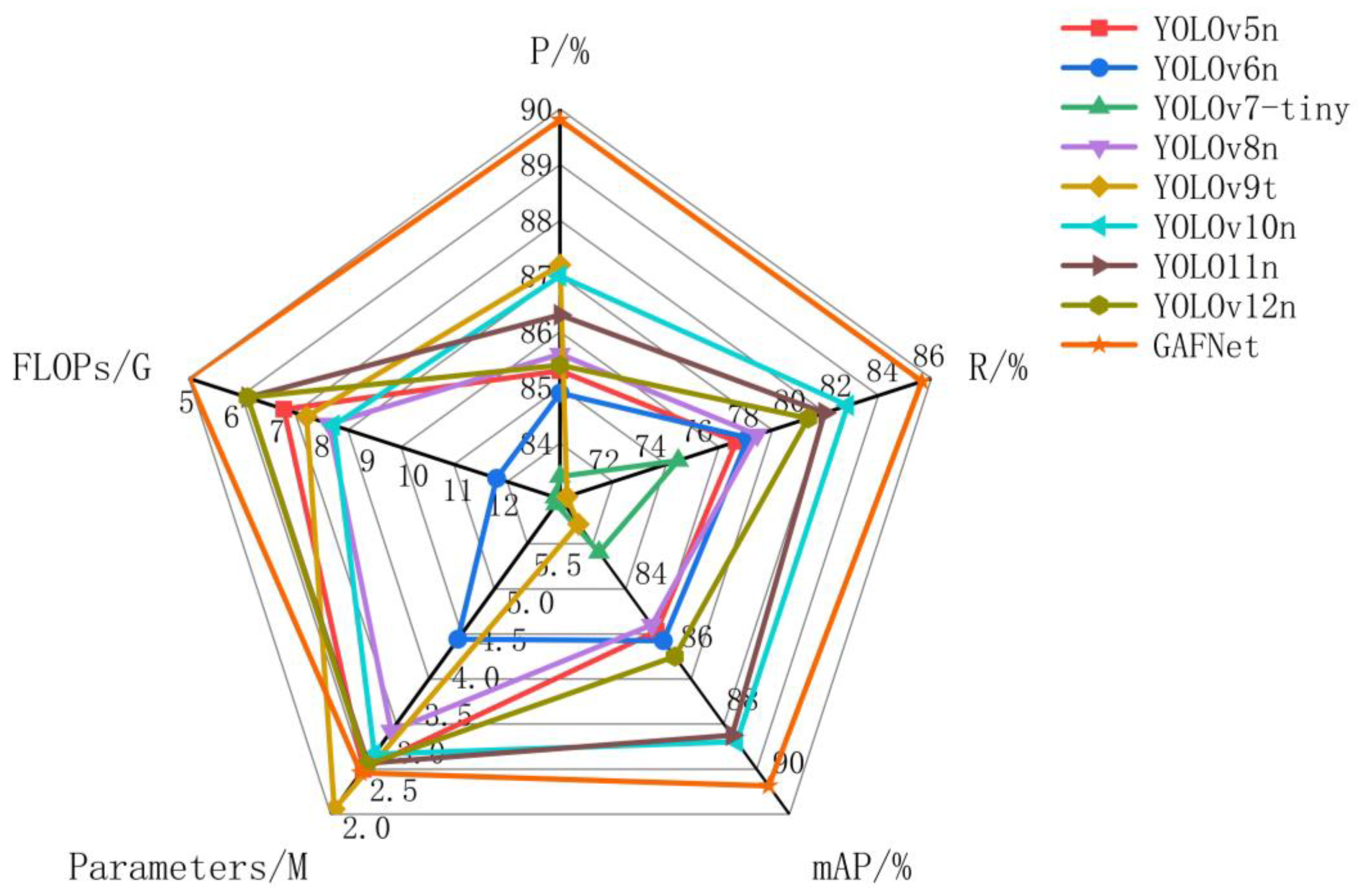 To visually compare the performance of the proposed GAFNet with the YOLO series, a radar chart based on