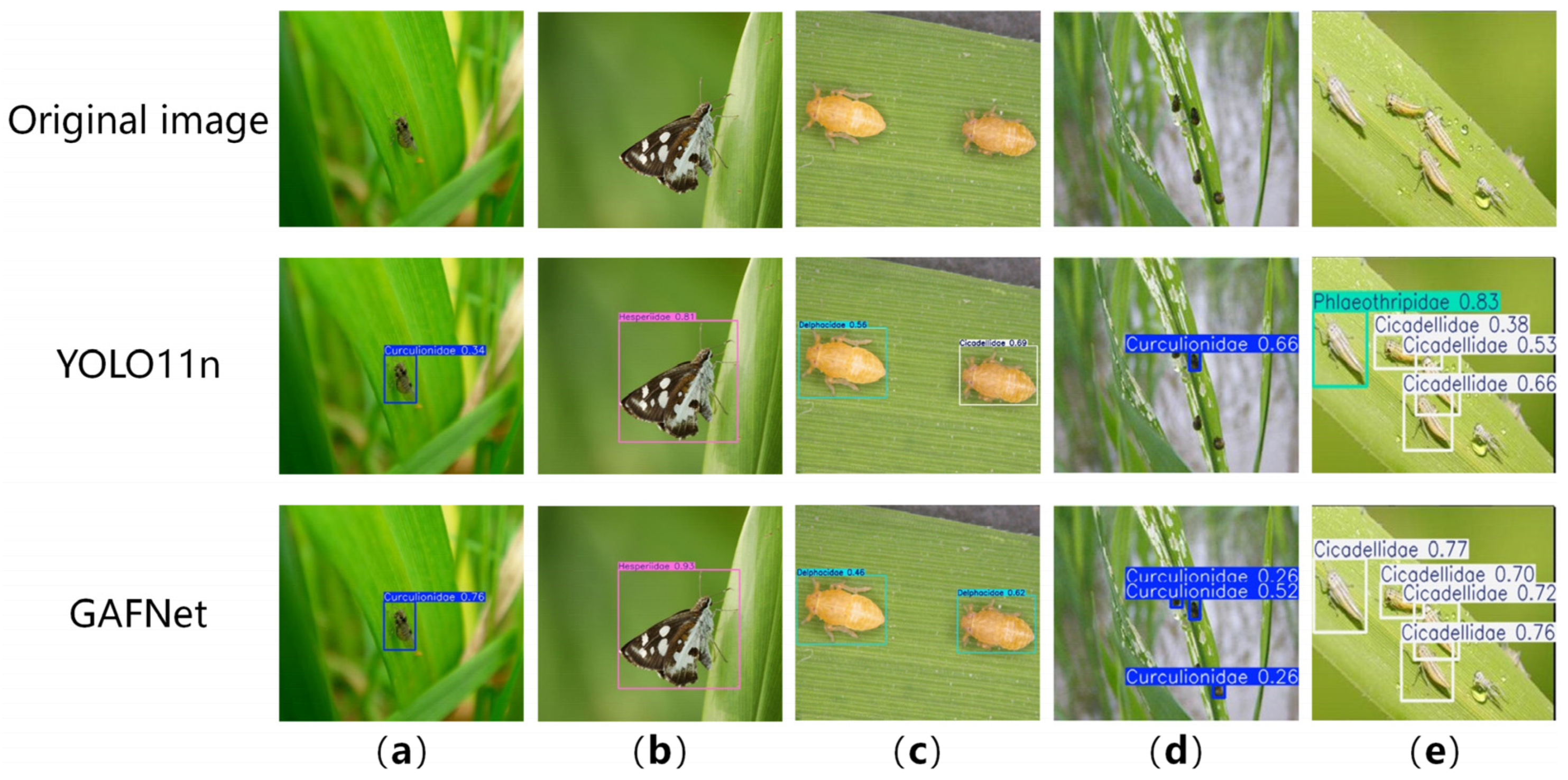 It is clear that the YOLO11n model suffers from false negatives and false positives in detecting certain pests. For example, in column (d), Curculionidae is partially missed; in column (c), a Delphacidae is misclassified as a Cicadellidae; and in column (e), a Cicadellidae is misclassified as a Phlaeothripidae. In contrast, the GAFNet model correctly detects all pests, accurately locates them with high confidence, demonstrating the robust performance of the improved model for pest detection in rice fields.