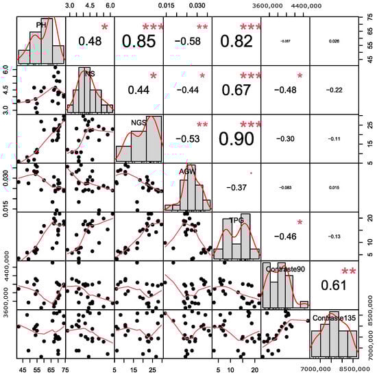 Analysis of Pearson correlations obtained to compare variables associated with components of pro-duction of the wheat TBIO Calibre and the contrast descriptor at 90° and 135° angles, obtained by transforming RGB images to grayscale in an experiment with wheat under conditions of greenhouse in the soil of Brazilian Cerrado. Plant height (PH), number of spikes (NS), number of grains per spikes (NGS), average grain weight (AGW), total prodution of grains (TPG), descriptor contrast angle of 90° (Descriptor 90) and descriptor contrast in angle of 135° (Descriptor 135) were used. The correlation values with the symbols, and represent significant differences at 0.5, 0.1 and 0.01%, respectively. The diagonal of the figure represents the frequency of the data, and the curve is associated with the distribution of the data. Below the diagonal, the circles with a white background represent the combination of the data for each pair of variables, and the red line represents the curve associated with the distribution of these values.