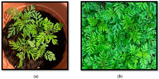 Morphological appearance of Ambrosia artemisiifolia observed in experimental fields at the Agronomy Institute field, Hungarian University of Agriculture and Life Sciences (MATE), Gödöllő 2100, Hungary: (a) individual plants grown in pots; (b) dense stand of A. artemisiifolia in the field—photographs collected by Sherwan Yassin Hammad, July 2024.