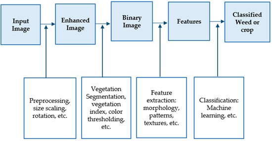To differentiate weeds from crops, UAV-acquired images can be analyzed using a combination of spectral properties, morphological characteristics, texture features, and spatial context. A common method for weed detection is image processing, which includes steps such as preprocessing, segmentation, feature extraction, and classification [18], as illustrated in Figure 4.