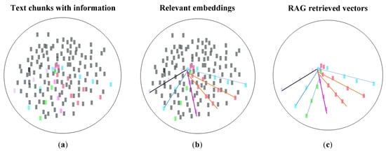 Illustration of the retrieval of embedding using RAG for LLMs: (a) the entire set of available data chunks retrieved from agriculture books; (b) data chunks relevant to the user query; (c) the result of the generation of relevant embeddings using RAG.