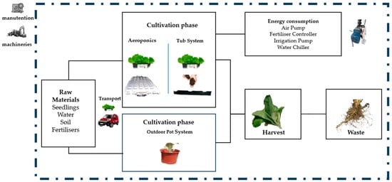 System boundaries for the LCA of the three lettuce cultivation systems: aeroponics, tub system, and outdoor pot system. The cultivation phase differs among systems, with energy consumption accounted for in the aeroponic and tub systems only. The output stages include harvest and waste management.