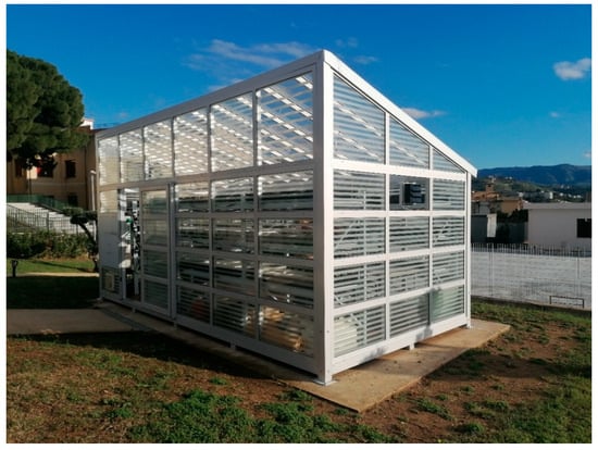 The greenhouse structure analyzed is located in Reggio Calabria (Latitude: 38.094833, Longitude: 15.660706, southern Italy) and is constructed with an aluminum frame and tempered glass panels, with dimensions of 6 m × 3 m × 3 m and a volume of 54 m3 (Figure 3). The greenhouse floor area is 18 m2. The interior setup consists of three racks, each equipped with three cultivation shelves, a total of 72 cultivation trays with a substrate blister system, two tanks for the nutrient solution, and an automated irrigation system that includes a water-cooling unit and an irrigation pump. The system also includes an automatic control unit for regulating environmental parameters, a cooling system to chill the water used in the aeroponic setup, irrigation and air pumps, and an LED lighting system (on/off). However, in this study, the LED lighting system was not used in either the A or TS growing systems and was excluded from both the One Click LCA and CCaLC2 analyses. Cultivation trays, tanks, and cultivation shelves were excluded from the system boundaries and were not considered in either One Click LCA or CCaLC2. Automatic systems, such as sensors, air and irrigation pumps, and the water chilling unit, were excluded from the greenhouse system boundaries and considered only for quantifying energy consumption in CCaLC2 (note* Table 1). They were not included in the LCA calculation of the greenhouse structure, as their individual contributions to embodied carbon were out of scope.