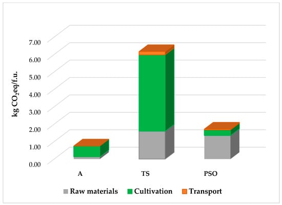 Breakdown of the Global Warming Potential (GWP) of the cultivation systems (A, TS, and PSO) into raw materials, cultivation, and transport contributions, expressed as kg CO2eq per functional unit (1 kg lettuce).