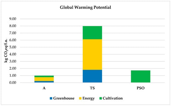 The environmental impact of the cultivation systems, expressed as kg CO2eq/kg FW, were 0.75, 6.17, and 1.72 for the A, TS, and PSO systems, respectively. Excluding the PSO, which represents an outdoor cultivation scenario, the GWP values were combined with the contribution of the greenhouse structure discussed in Section 4.3 (0.23 and 1.81 kg CO2eq/kg of lettuce for the A and TS systems, respectively). As a result, the total GWP per f.u. amounted to 0.98 kg CO2eq/kg FW lettuce for the A system and 7.98 kg CO2eq/kg FW for the TS. Figure 7 illustrates the GWP per f.u. of each cultivation system, including the greenhouse structure.