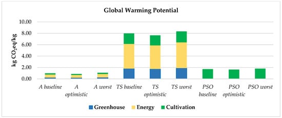 The life cycle inventory for A and TS additionally incorporates the structural components of the greenhouse. The yield for greenhouse-based systems was calculated in the same way as for PSO but considering the greenhouse’s maximum capacity (Section 2.4).