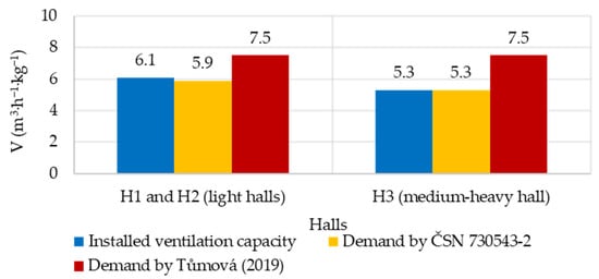 The ventilation air flow of the installed fans in the halls meets the requirements for the summer period according to the ČSN 73 0543-2 standard [65], but they do not reach the recommended capacity according to [66] (Figure 7).