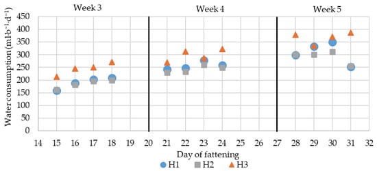 Relative mortality and water consumption in selected periods of 3–5 weeks are shown in Figure 8 and Figure 9 and in Table 13 and Table 14. In the third week of fattening, the relative mortality was the same in all houses. In the fourth week of fattening, a significantly lower relative mortality was recorded in house H3 and, conversely, a significantly higher water consumption compared to houses H1 and H2. In the fifth week of fattening, the same relative mortality was found in all houses. Water consumption was significantly different between houses H2 (the lowest consumption) and H3 (the highest consumption).